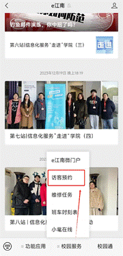 手机关注“e江南”微信公众号,点击屏幕下方“校园服务”中的“访客预约”,进入后点击“我的预约”,点击“查看访客码”即可获得访客码。进入校园时出示访客码。