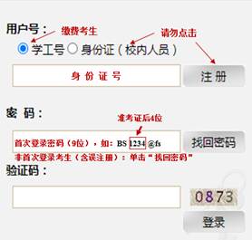 网上缴费平台”,完成缴费。考生账号已开通,切勿自行注册。收费标准:80元/生(仅申请考核考生,硕博连读考生无须缴费)。用户号在“学工号”输入正确的身份证号,初始密码(9位):“BS”+准考证编号后4位+“@fs”(准考证查看网址://yzgmis.manhuacabinet.com/zsgl/bswb/login.aspx),如“BS1234@fs”。非首次登录缴费系统的考生(含往年报考考生及误注册考生)请使用“找回密码”,登录并缴费。