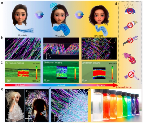 龙柱教授团队联合安徽农业大学叶冬冬团队,创造性地开发了美学纤维素纤维(ACF)的制备方法,破解了上述难题。所制备的ACFs在交叉偏振光下呈现斑斓的彩虹色,还表现出极强的韧性,即使单根纤维也可承受100克的重量,并且经过反复缠绕和解缠,纤维表面的有序纳米结构并未被破坏。更有趣的是,作者通过拉曼成像证实,简单的水触发即可调控ACF的内应力,从而实现纤维三维形态的自主定制:湿态下,纤维内应力极低,可以实现纤维的临时造型;而随着纤维逐渐干燥,纤维内应力开始变大,从而实现纤维复杂3D造型的记忆。