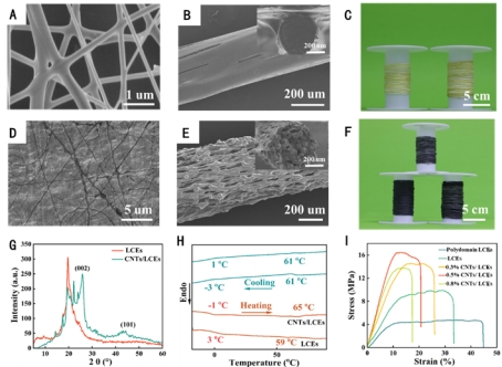图2:LCEs纱线致动器和CNTs/LCEs纱线致动器的物理形貌和化学结构表征。