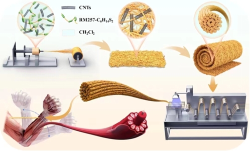 图1:静电纺丝CNTs/LCEs复合纤维致动器制备工艺示意图。