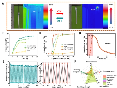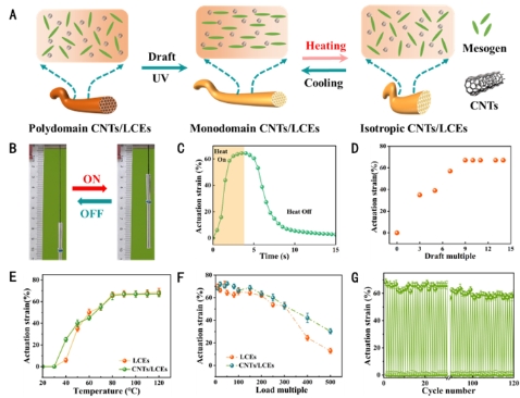 近年来,智能材料因其具有传感、信息识别、快速响应、自愈和自适应等特征而受到广泛关注。将环境刺激转化为机械功的致动器被广泛应用于智能驱动、软机器人和人工肌肉等领域。作为一类新型的智能材料,液晶弹性体 (LCEs) 是一种轻交联的聚合物网络,它结合了液晶的自组织特性和响应性与聚合物橡胶的熵弹性,具有独特的可逆形变特性。然而,制备具有高驱动率和快速响应的液晶弹性体复合智能材料仍是一项巨大的挑战。