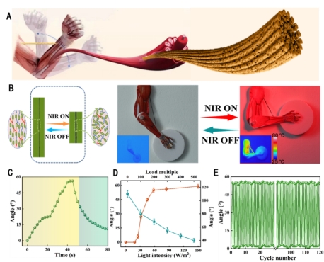受人类的骨骼肌肉系统的启发,研究人员制备了一种基于CNTs/LCEs纱线的人工肌肉,如图5A所示。在单轴液晶基体中使用CNTs可实现具有大工作能力和快速响应的光热致动。为了模拟实际应用场景,设计并制作了基于CNTs/LCEs纱线的红外光控制人工肌肉。在周期性红外光照射下,验证了CNTs/LCEs纱线模拟人工肌肉的可能性。当暴露在光线下时,复合纱线收缩并抬起前臂,同时固定大臂。当纱线连接到人工肌肉表面时,在相同的照射功率(1.27 W)和光斑面积(0.85 mm2)下,人工肌肉弯曲角度分别为145°至85°。因此,具有高驱动率、快速响应和良好的机械性能的柔性CNTs/LCEs纱线,在致动器、人工肌肉和智能纺织品等众多领域具有潜在的应用前景。