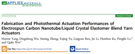 近日,江南大学魏取福教授团队在期刊《ACS Applied Materials & Interfaces》上,发表了最新研究成果“Fabrication and Photothermal Actuation Performances of Electrospun Carbon Nanotube/Liquid Crystal Elastomer Blend Yarn Actuators”。研究者通过静电纺丝技术和两步交联策略,制备出一种高驱动率、快速响应的光热碳纳米管/液晶弹性体(CNTs/LCEs)复合纤维纱线。与其他光热材料相比,CNTs在可见光和红外光谱波段具有较宽的光吸收、高光热转换效率和良好的导热性,能够将获得的热能迅速传递到复合液晶弹性体纱线上,从而实现有效的光热驱动。