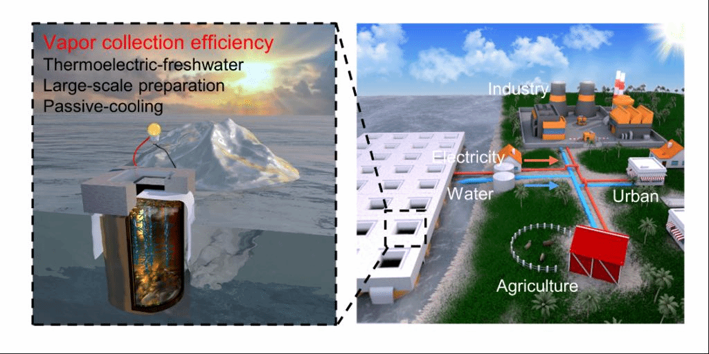 通过这种向下冷凝的方式,解决了冷凝液滴对入射光的损耗问题。通过对纤维基供水通道的结构设计,可防止海水滴落同时保证高效地水蒸气透过。利用光热材料与纤维基供水通道间的温差发电。通过对冷凝器内部进行层级纳米亲水结构设计,强化传热传质及冷凝效果。同时,进一步将冷凝器浸渍在海水中,可加快蒸汽冷凝焓热的释放,大大提高冷凝效率。
