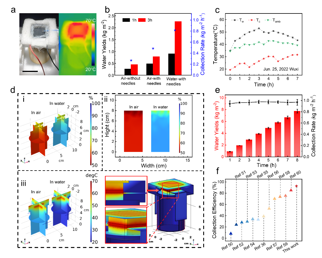 图3. 水蒸发装置冷凝性能优化。a. 装置测试图。b-e. 不同的装置结构设计其蒸汽收集性能,软件模拟分析冷凝效果,冷凝效果的稳定性测试。f. 蒸汽收集效率与现有文献的对比。