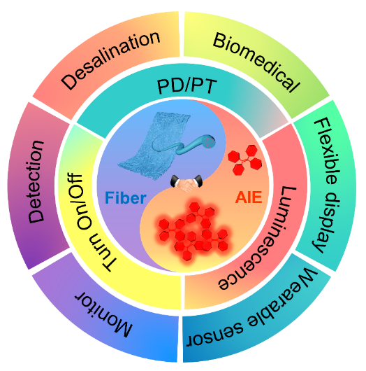 首先从应用的角度出发,介绍几种具有不同性质的典型AIEgen(如光热和光动力特性、具有“开/关”模式荧光探针及红光、蓝光及白光显示等)以及这些性能的产生机理,这将有助于纤维或工程领域的研究人员理解AIE的基本概念。