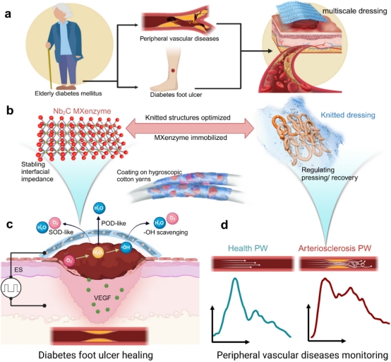 针对这一挑战,本研究设计了一种多功能敷料,创新地融合了宏观的针织传感器和微观的MXene纳米酶,能够在创面这一湿度变化的环境下实现高保真脉搏波波形监测,并通过纳米酶赋予敷料抗炎活性,显著促进伤口愈合。患者在接受治疗的同时,还能实时监测外周血管健康,实现了诊断与治疗双重效果。