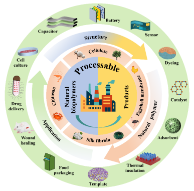 随着全球人口的不断增长和经济的快速发展,世界对材料、化学品和能源的需求不断增加。面对全球聚合物市场需求的持续激增与加工成本的不断攀升,如何确保全球聚合物供应链的稳定性与可持续性构成了前所未有的艰巨挑战。此外,由于低效的回收系统和不完善的废物管理基础设施,聚合物的广泛应用对环境的影响加剧,加剧了寻找并推广源自非化石资源的可持续合成聚合物替代品的紧迫性。从天然生物聚合物中提取的下一代环境友好且具有成本效益的功能材料受到了人们极大的关注。蛋白质和多糖由于其低成本、来源丰富和易于使用而常被人们以天然的形态直接用于应用研究。然而,由于其应用领域有限且自然形态和组成较为复杂,将它们直接加工/转化为与原始状态性能相当的材料面临着巨大的挑战。尽管在这一领域已经进行了数百项突破性的研究,但现有的关于环境工程和生物医学领域生物材料进展的综述往往只关注单个天然生物聚合物的制备和具体应用,而对其可加工性、可持续性和多样化应用的关注较少。