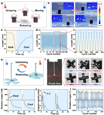 图4. a) 由LCE/BC纱线致动器组成的刺激响应软抓手示意图。 b) 软抓手在热刺激下工作的物理和红外图像。c) 软抓手工作过程中LCE/BC纱线长度与时间的关系曲线。 e) 基于LCE/BC纱线致动器的无源微型马达示意图。g) 旋转角度和 h) 叶片角速度随时间变化的曲线。 i) 无源微型马达的重复使用性能。