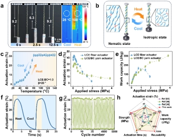图3. LCE/BC螺旋纱线致动器的热驱动性能。 a) LCE/BC纱线致动器可逆热收缩时的物理和红外图像。 b) LCE/BC螺旋纱线可逆热驱动机理图。 c) LCE/BC 螺旋纱线致动器的驱动应变随温度变化的曲线。 d) LCE纤维和LCE/BC 螺旋纱线致动器的驱动应变分别随施加应力变化的曲线。e) LCE纤维和LCE/BC螺旋纱致动器的工作能力分别随外加应力变化的曲线。 f) 热驱动过程中驱动应变随时间变化的曲线。 g) LCE/BC螺旋纱致动器的热驱动重复使用性。 h) LCE纤维/纱线致动器的四个驱动参数和机械强度的雷达图。
