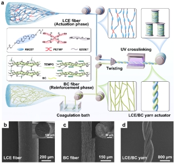 图1. a) LCE/BC螺旋纱线致动器的制备过程示意图。b) LCE纤维、c) BC纤维和d) LCE/BC 螺旋纱线致动器的扫描电子显微镜图像(插图显示横截面形态)。