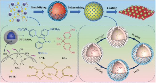 作者首先合成了具有热致变色功能的纳米胶囊,将其作为 Pickering 乳化剂稳定含有可聚合单体、光敏染料等成分的油相,进而通过热聚合反应制备出光热双响应变色多室微胶囊。该微胶囊结构独特,较大的隔室封装了对光敏感的染料,而较小的隔室则填充了热致变色的相变材料,通过调控微胶囊表面较小隔室纳米胶囊的密度,在光和热的双重刺激下,能够呈现出多种丰富的色彩,具有较高的应用潜力。