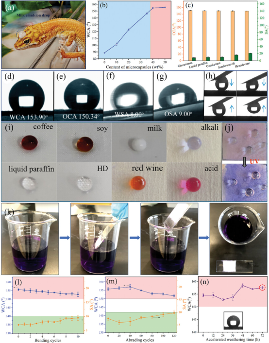 涂层织物还展现出优异的超疏水和超疏油性能。随着微胶囊在涂层中含量的增加,织物的疏水性能逐渐增强,同时,对多种油性物质,织物也具有很高的接触角和较低的滚动角,表现出良好的超疏油性能。