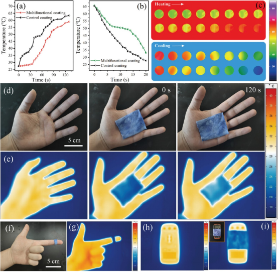 涂层织物在加热时升温慢,冷却时降温也慢,起到了良好的储能和隔热作用。在实际应用场景测试中,将涂层织物放在测试人员手上,其温度稳定且明显低于手掌温度,包裹手指时能有效隐藏红外热量,实现红外隐身功能。