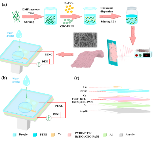 图1. PVDF-TrFE/BaTiO3/CBC-PANI纳米纤维膜的制备示意图以及DEG和PENG的构造示意图