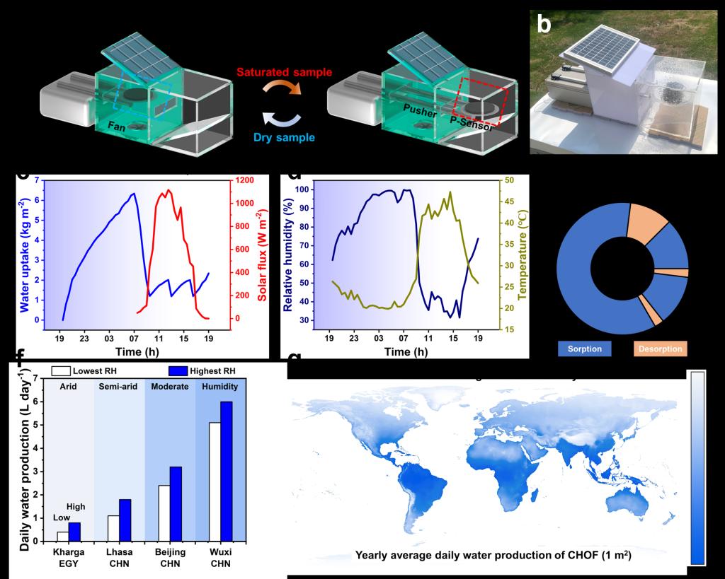 拉曼成像显示COF表面O-H/C-H强度比随吸水时间升高,且截面呈现明显颜色梯度,证实水分由表及里的扩散;在90%湿度下,CHOF吸水率(5.65 kg m⁻²)远超纯甘油(2.92 kg m⁻²)和无甘油对照组(0.54 kg m⁻²)。蜂巢结构的大比表面积使其吸水性能优于平面(4.80 kg m⁻²)和圆柱结构(3.57 kg m⁻²)。蜂巢单元底部温度高于顶部,结合CB的光热转换,使CHOF脱附速率(0.0407 kg m⁻² min⁻¹)达平面结构的1.25倍。智能取水装置通过推拉杆交替切换暗室(吸水)与透明舱(脱附),在无锡户外实现单日3次循环,日产水6.70 kg m⁻²。该材料在干旱至潮湿地区均适用,预测年产量超1.00 L day⁻¹。CHOF通过可编程编织技术将毫米级凝胶纤维组装为米级织物,解决了材料放大时的性能衰减难题。其高机械强度、90.7%的太阳能效率以及甘油零泄漏特性(收集水质符合安全标准),为商业化大气取水提供了新范式。研究团队指出,该设计可进一步适配低日照地区的电加热脱附模式,助力全球水资源可持续供给。