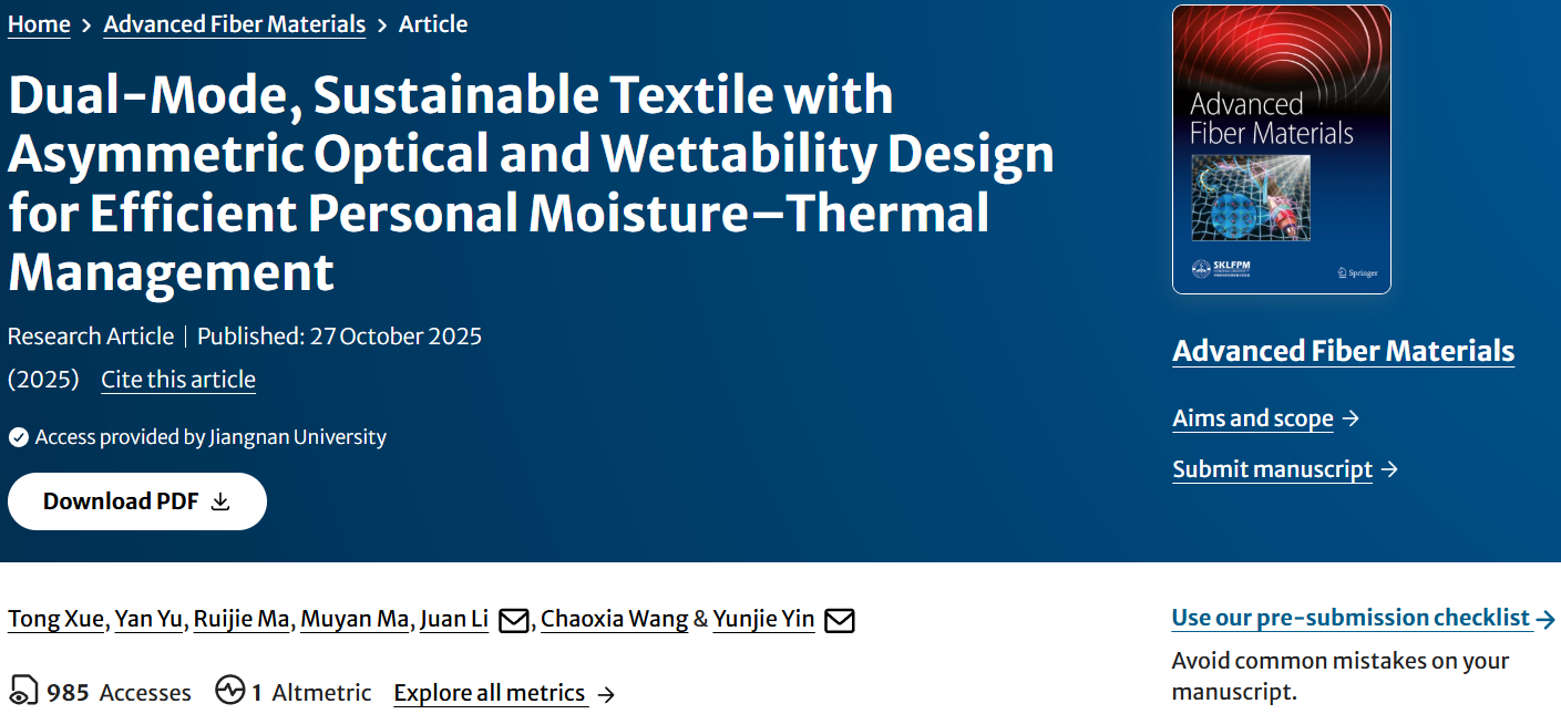 智能纺织新材料研究室殷允杰教授在国际顶级期刊Advanced Fiber Materials上在线发表了题为“Dual-Mode, Sustainable Textile with Asymmetric Optical and Wettability Design for Efficient Personal Moisture-Thermal Management”的研究论文。该研究通过分层静电纺丝技术,制备了一种具有不对称光学性能、润湿性和孔径分布的双模式聚乳酸基个人热管理纺织品(DMTex),用于高效的个人湿热管理。独特的光学结构设计和功能颗粒的添加使DMTex具有优异的光学性能。三层结构设计赋予DMTex优异的单向导湿和防反渗性能。同时,DMTex还具有良好的耐磨性、生物相容性和可降解性。这种双模且可持续的DMTex在实现高效的个人湿-热舒适性方面展现出巨大潜力。漫画柜