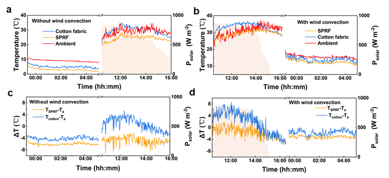 图4.多级梯度结构静电纺丝织物的户外辐射冷却性能