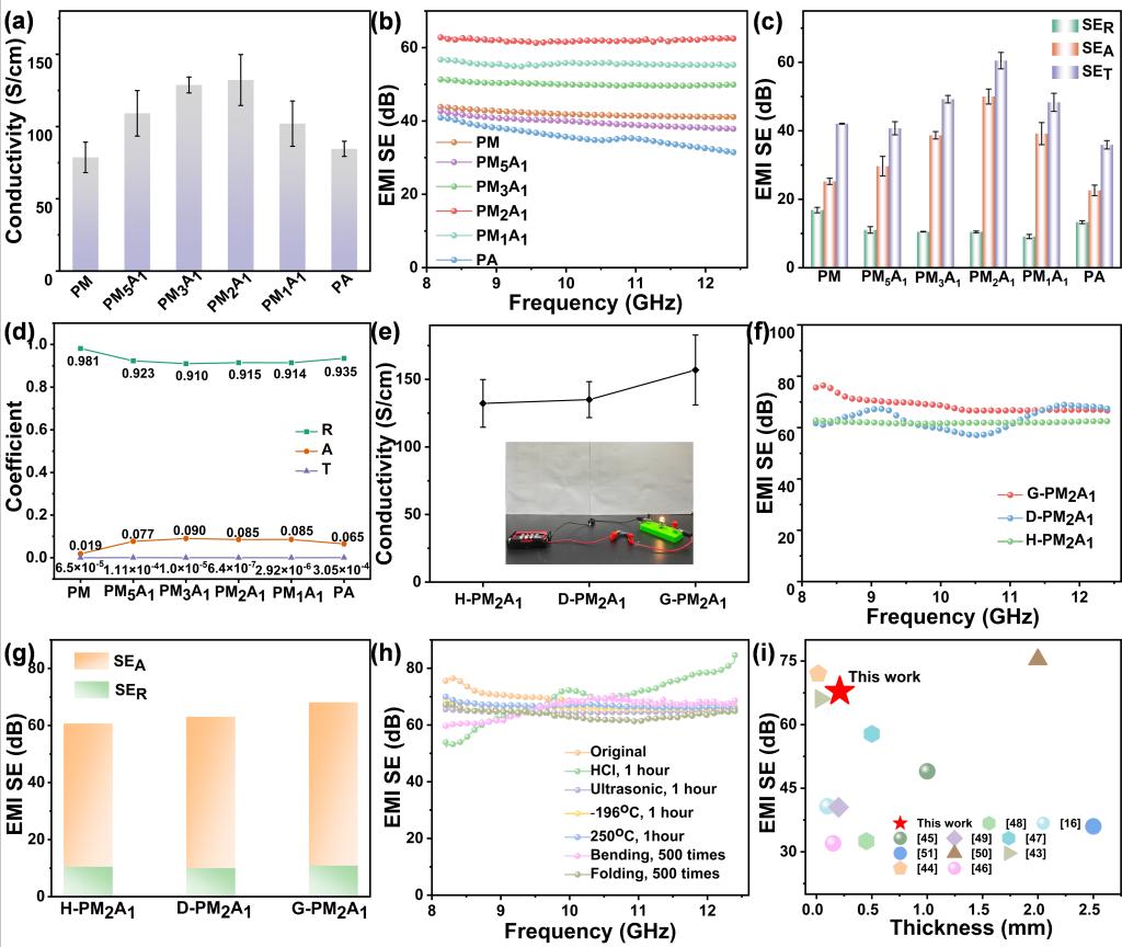 该方法以轻质柔性的聚酰胺酸(PAA)静电纺丝薄膜为基底,通过真空辅助抽滤技术和热酰亚胺化工艺,将AgNWs和MXene精准沉积,构建了多层梯度导电结构(图1)。本研究探索了不同维度的纳米填料协同效应,当MXene与AgNWs质量比为2:1时,两者形成的“桥接效应”显著优化了三维导电通路。在此基础上设计的梯度结构复合薄膜(G-PM2A1),在仅0.21 mm的超薄厚度下,其X波段电磁屏蔽效能(EMI SE)高达67.85 dB(图2)。
