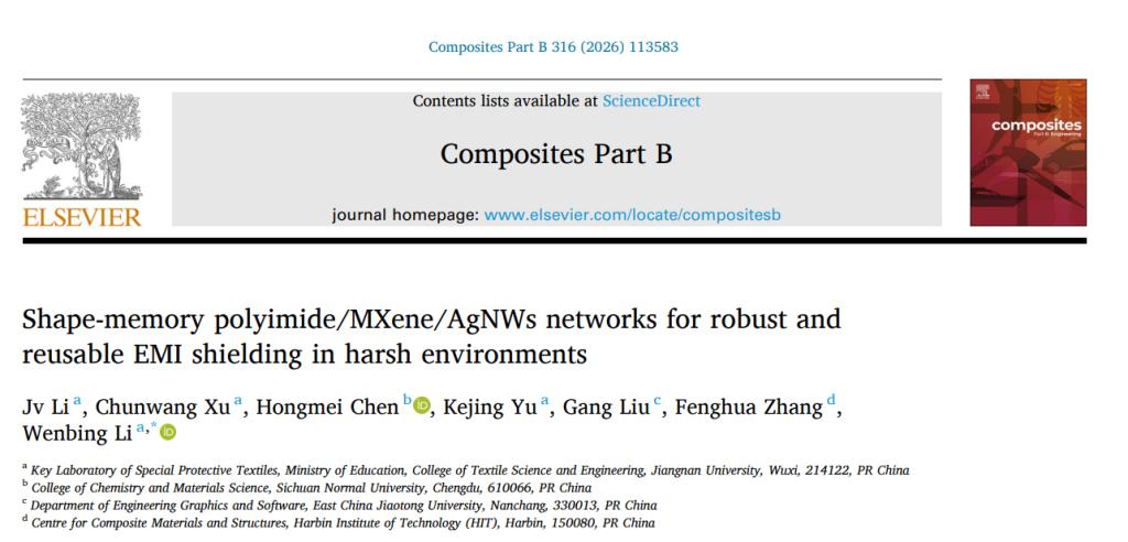 先进纤维与纺织复合材料研究团队在复合材料领域顶级期刊《Composites Part B: Engineering》(IF=14.2)上发表题为“Shape-memory polyimide/MXene/AgNWs networks for robust and reusable EMI shielding in harsh environments”的研究论文。该研究提出了一种基于形状记忆聚酰亚胺(PI)的梯度导电网络构建策略,通过将二维MXene和一维银纳米线(AgNWs)组装到静电纺PI纤维基底上,成功制备了具有“静态屏蔽”到“动态适应”转变能力的柔性电磁屏蔽复合薄膜。该研究为开发适用于复杂形变和严苛环境的新一代电子防护材料提供了创新思路。漫画柜