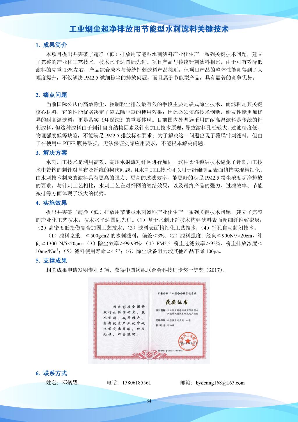 科研成果-工业烟尘超净排放用节能型水刺滤料关键技术