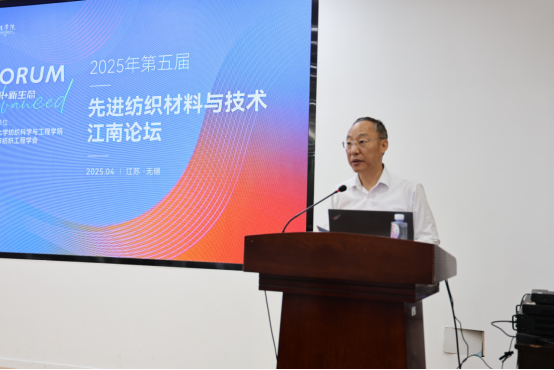 朱飞代表学校致辞,他向莅临论坛的各位学者和嘉宾表示热烈的欢迎和感谢。希望各位专家学者相聚于此,以学术交流赋能纺织学科创新发展,推进先进纺织技术交叉融合。