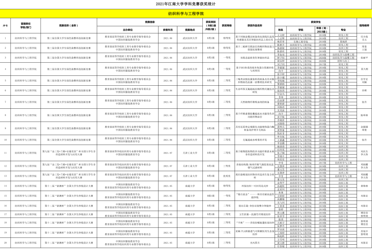 学子共获奖7项,其中特等奖1项、一等奖1项、二等奖1项、三等奖4项;由黄锋林老师指导,纺织1801班金利平同学负责的科创作品《环保纺织—可回用花式纱》荣获全国特等奖。在第三届全国大学生绿色染整科技创新竞赛中,漫画柜