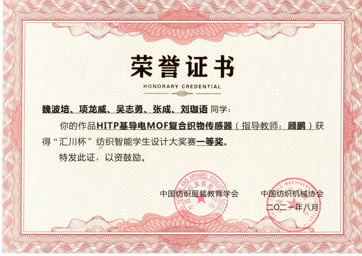 顾鹏老师指导,轻化1802班魏波培同学负责的科创作品《HITP基导电MOF复合织物传感器》(参赛学生:魏波培、项龙威、吴志勇、张成、刘珈语)荣获大奖赛一等奖。