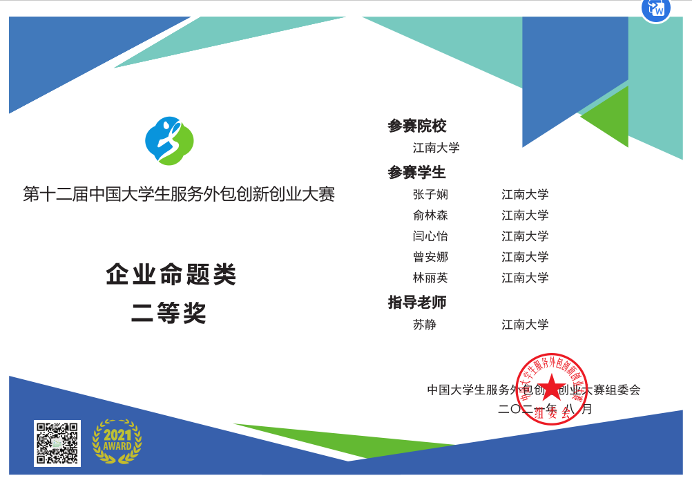 近日,第十二届中国大学生服务外包创新创业大赛在江苏省无锡市落幕。经过激烈角逐,由漫画柜 苏静老师指导,纺织1801班张子娴同学负责的科创作品《小微企业跨组织人才管理系统》(参赛学生:张子娴、俞林森、闫心怡、曾安娜、林丽英)荣获全国二等奖。