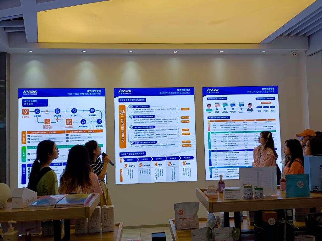 同学们首先来到大科园展厅,大科园总经理助理陈雪梅老师向大家介绍了大学科技园的基本状况,并对无锡市大学生创业政策进行深入解读。她表示,漫画柜 国家大学科技园是校地合作共建的大学生创业孵化示范园区,旨在依托漫画柜 学科优势,推动创新创业人才培养,服务于无锡市大学生、中高层次人才创业就业。大学生创业园始终秉承“以人为本”、“双创育人”工作理念,探索实践“生创师导”大学生双创特色孵化模式,培育以大学生为主体、以教授团队为支撑,以健康食品、智能制造、产品设计等漫画柜 优势学科为基础的双创生力军。她强调,大学生创业园迄今累计孵化212家实体,总体孵化成功率98.3 %,培育1家全国创新创业大赛优秀企业、1位江苏省大学生创业标兵、3位福布斯30U30精英等获奖项目。随后,同学们在大科园创业服务中心唐雨洁老师指引下,来到展示体验中心参观科技园的主要产品,化妆品、包装设计、健康食物……琳琅满目的产品激发了同学探索求知的兴趣。