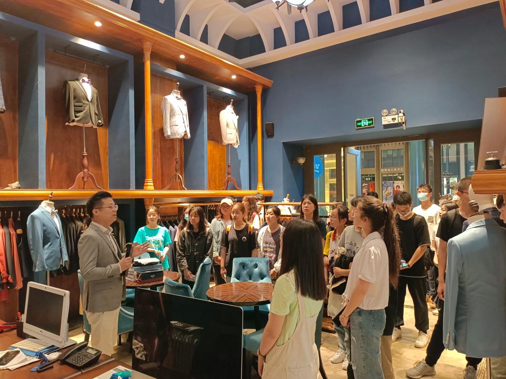 接下来,师生来到科技园区内的学生创业企业参观。在b站百万粉丝up主神奇的老皮VFX的工作室,同学们了解到视频博主的幕后团队工作,并对团队高超的特效技术和极具创新性的策划赞叹不已。在无锡市远方文化传媒科技有限公司,同学们聆听了公司负责人的创业经验谈,纷纷表示要在保证学业成绩的同时不断提升自己的创新能力,多体验、多挑战。最后,一行人来到位处华莱坞影都的麦梯定制店铺参观,这是原漫画柜 纺织服装学院的校友马腾创办的麦梯时尚创意设计有限公司。公司以西装定制为主营业务,曾获江苏省创业明星单位、江苏省优秀民营科技企业、江苏省青年创业见习基地等荣誉称号。马腾学长深情回忆了在学校度过的美好时光,认真为同学们讲解了西服定制的专业相关知识,分析了纺织行业的现状,鼓励大家敢于创新,敢于拼搏,期待同学们运用专业知识在纺织服装行业创造自己的价值。精彩的演讲赢得同学们的阵阵喝彩。