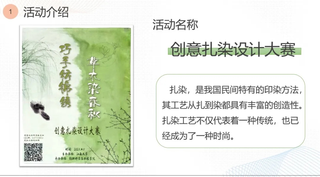 答辩中,活动负责人以学院特色、专业特长为切入点,介绍扎染设计大赛的目的、背景、流程、特色和反思等。扎染,是中国千年传承的工艺,一针一线、一浸一染间都是历史与文化的沉淀,也是历史与文化的新生。传承扎染等优秀传统工艺是纺织学子义不容辞的责任。“百年锦绣—创意扎染设计大赛”围绕“巧手纺锦绣,草木染春秋”的主题进行,选手可根据所提供的三个作品主题任选其一进行作品的制作。江南好风景:江南无所有,聊赠一枝春,在这充满诗情画意的季节里,选手们可以借此主题描绘心中的“江南风景图”。乡土中国情:依稀雾里故乡貌,都付扎染中国心,求学在外,故乡依然是我们心灵的净土,选手们可以借此主题表达对故乡的思念。青春心向党:传承红色精神,渲染魅力青春,身为共青团员的我们对党又有怎样的想象呢,选手们可以借此来表达对党的认识及未来的期许。