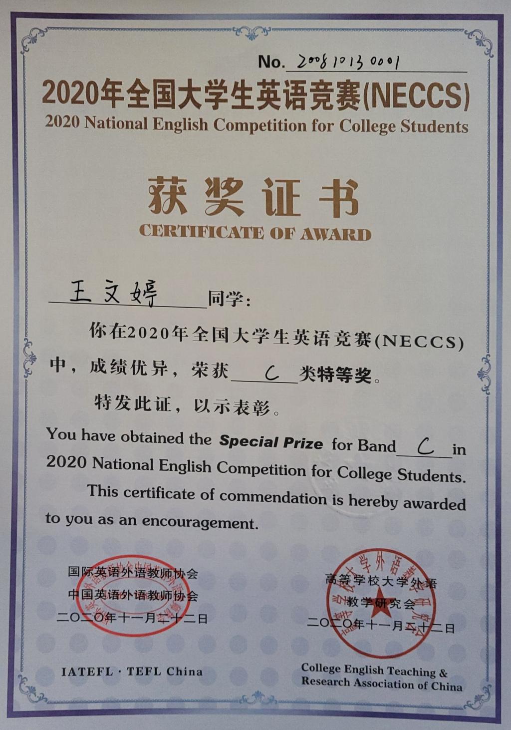 2020年全国大学生英语竞赛特等奖(校赛中C类第一名)