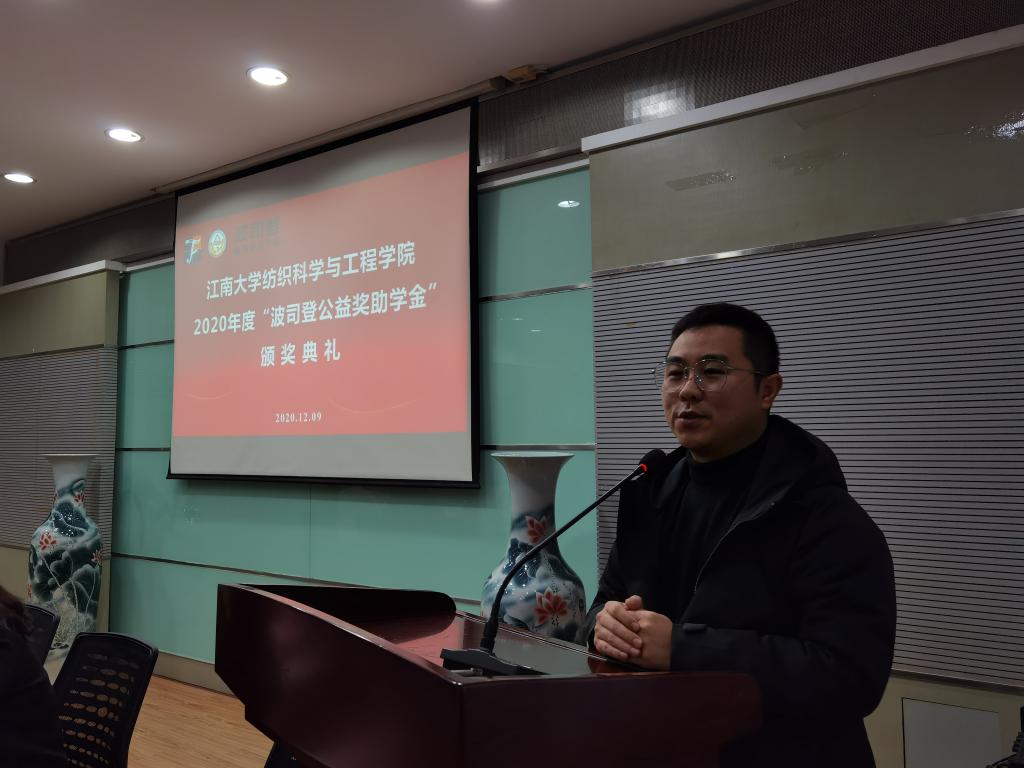 19纺硕专业学生王飞宇作为获奖学生代表发言,王飞宇同学在发言中,代表全体获奖学生向设立公益奖助学金的波司登集团及波司登公益基金会,以及关心和关注我们成长的学院领导和老师们表示衷心的感谢。他结合自己的求学历程,号召同学们要以波司登集团为榜样,尽我所能,达我所成,以优异的成绩回报社会回报企业,成为为国家建设和发展有用的人才,为社会做出贡献。