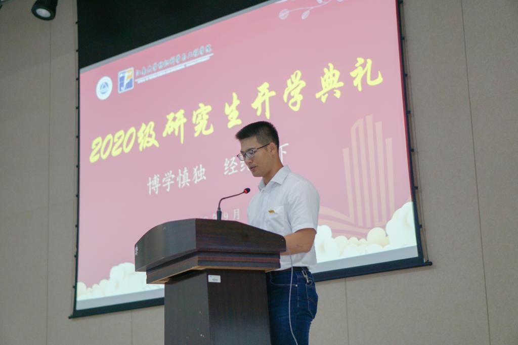 接下来2020级研究生江洋同学作为新生代表发言,他就“何为研究”进行了一番探讨,他表示,左石右开,精诚所至、金石为开为“研”,深入洞穴,究其奥秘为“究”,研究需要坚持,坐得住冷板凳;需要探究,恒心锐意进取;更需要精益求精,用匠心实现初心。