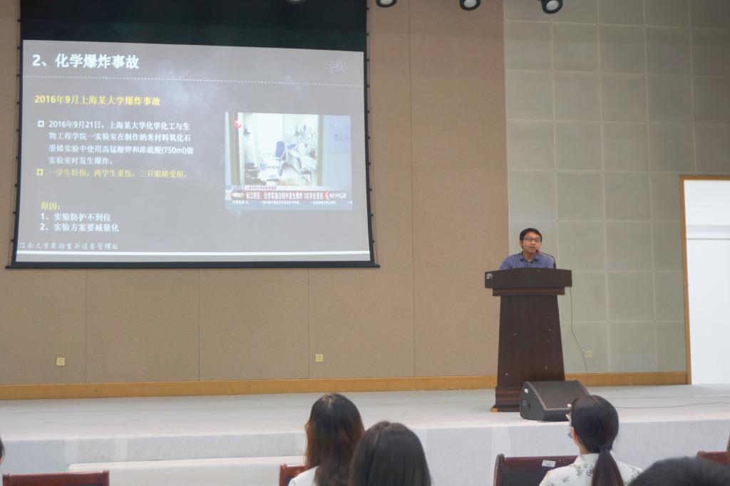 在开学典礼后,副院长刘庆生教授进行了实验室安全教育讲座,从实验室恰当着装、实验室安全设施、标准操作程序以及行为习惯等方面对于实验室安全规范操作进行讲解。他告诫研究生新生,初入实验室更应注意实验安全,做好防护措施,保持身体健康,才能安全实验,共同维护良好的科研、实验环境。