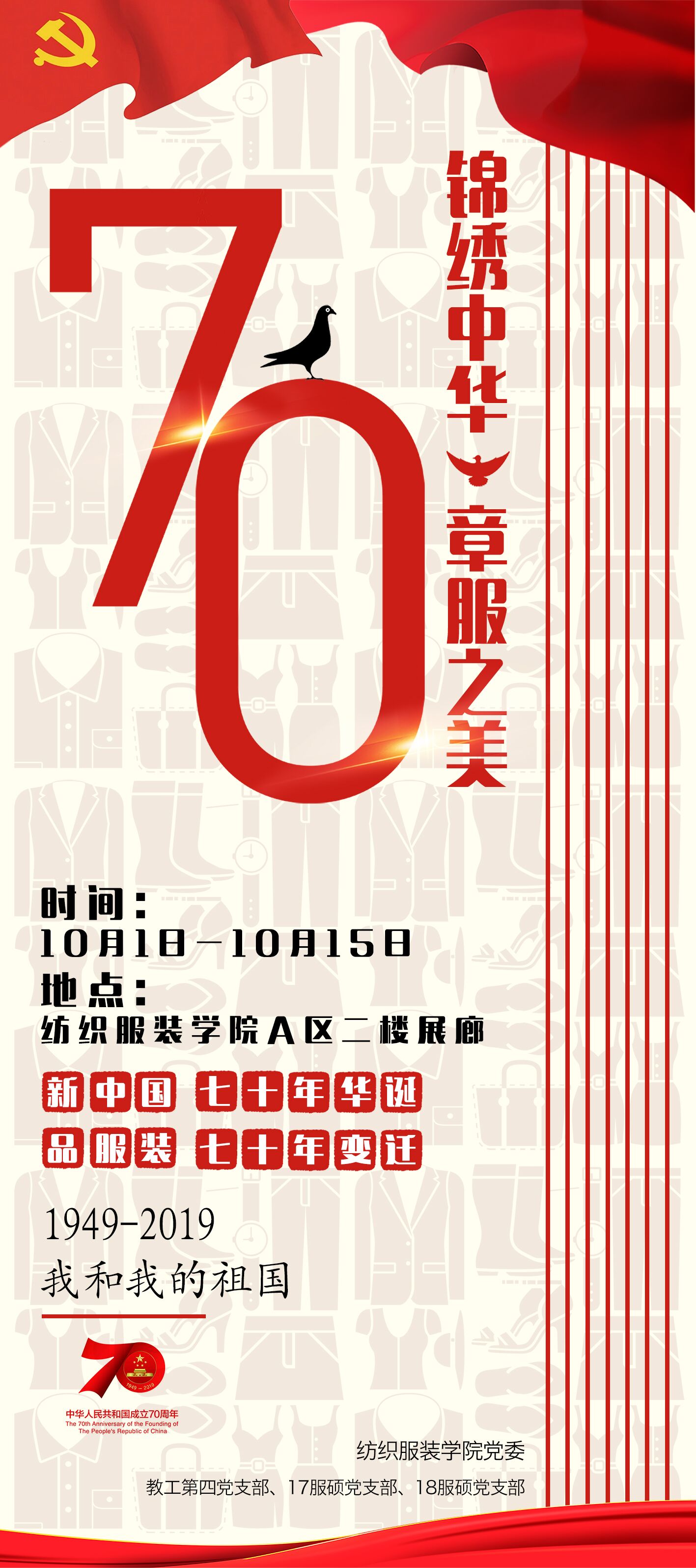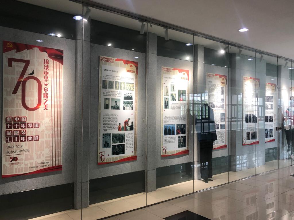 2019年9月30日,纺服学院师生党支部联合开展的“锦绣中华章服之美”——新中国成立70周年服装变迁史海报展在学院二楼展厅开展,展览预计为期半个月。