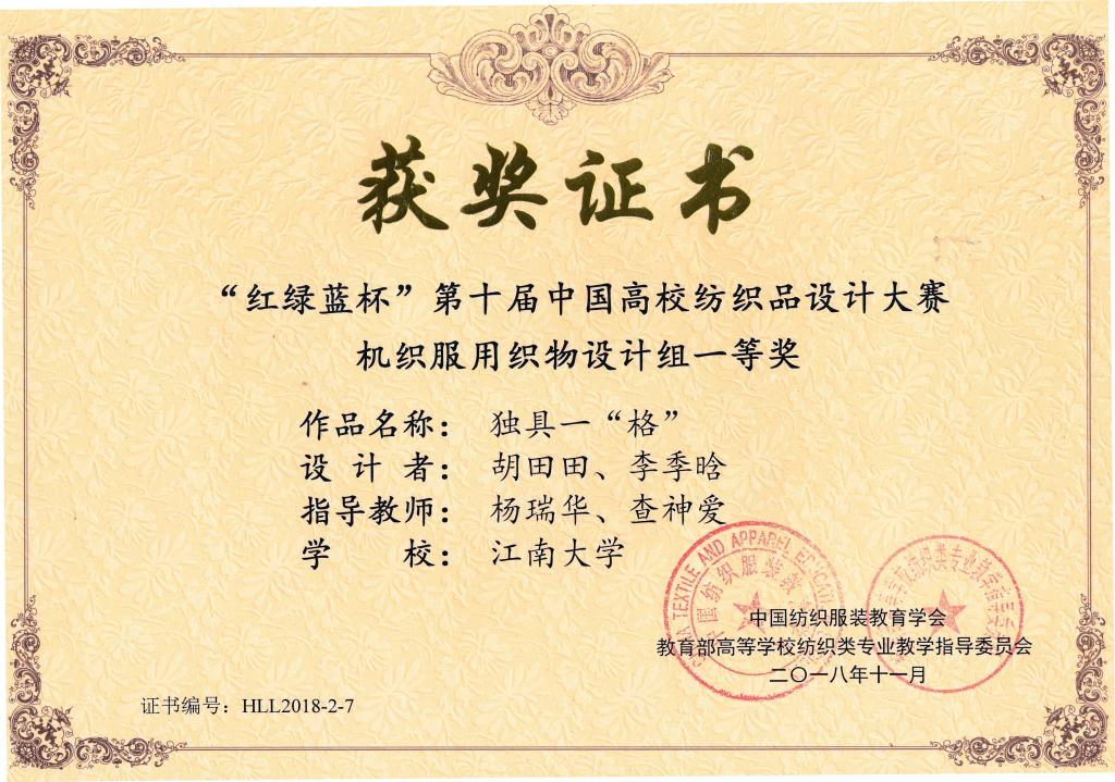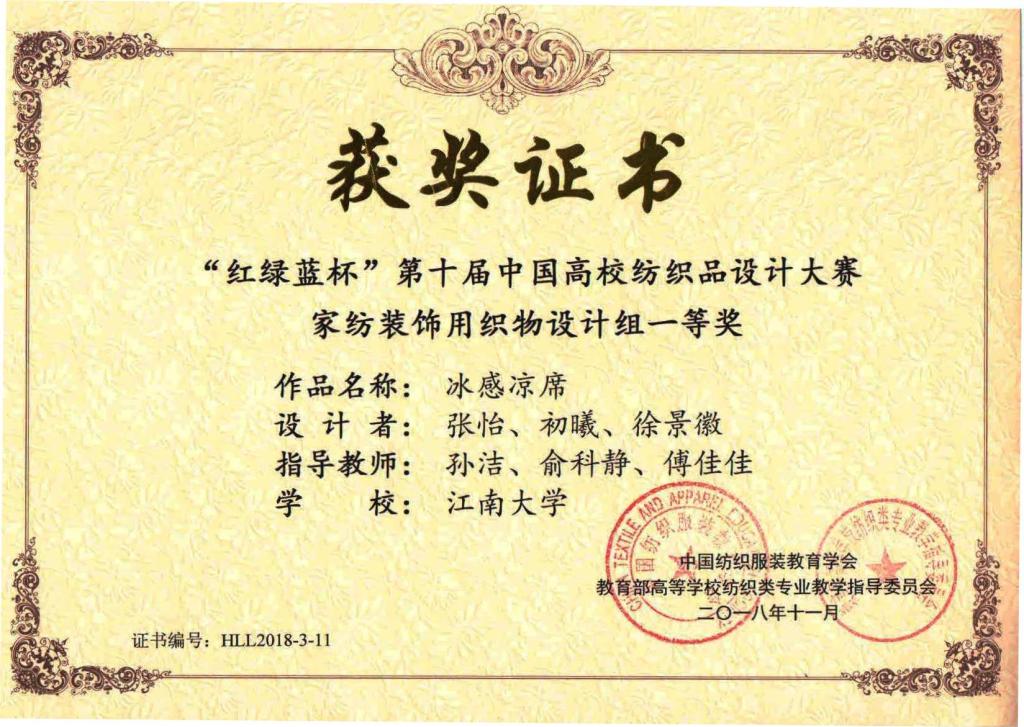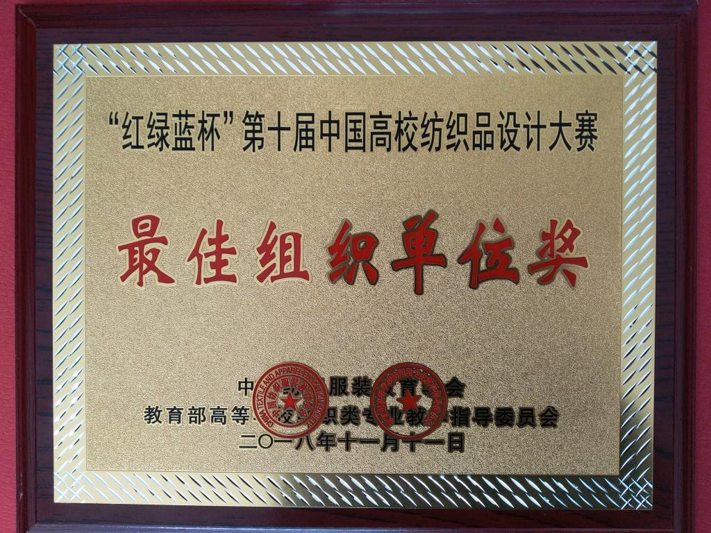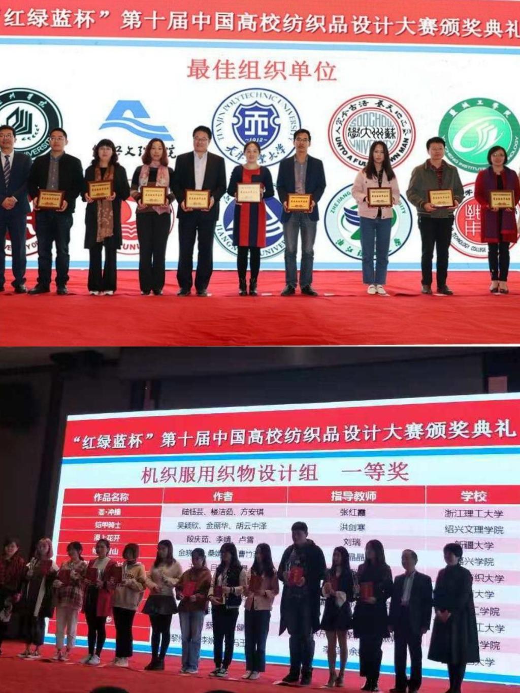 11月11日,由中国纺织服装教育学会、教育部高等学校纺织类专业教学指导委员会联合举办的第十届“红绿蓝杯”中国高校纺织品设计大赛颁奖典礼在浙江绍兴柯桥隆重举行。本届大赛以呈现数字技术新材料,弘扬主流健康文化,倡导科技时尚低碳生活为主题,致力于发掘和推荐优秀的纺织品设计开发人才,打造中国纺织品设计开发与企与纺织生产贸易企业的产、学、研密切合作平台。来自全国40所纺织院校的1370件作品参加了角逐。
