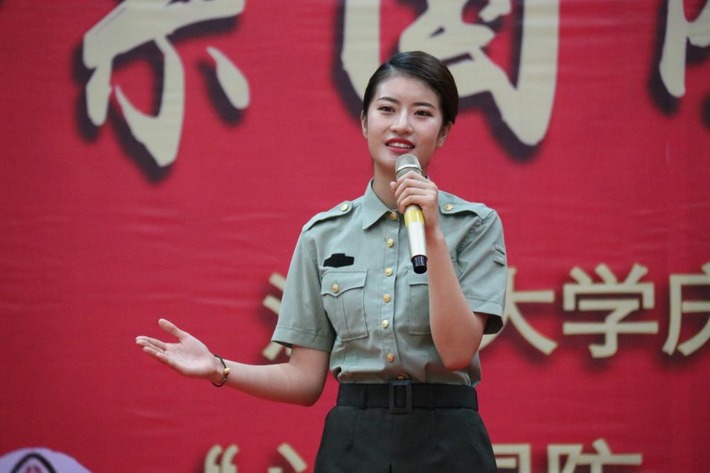王薇婷同学以日语开头,回顾青岛被日本割据时那段屈辱不堪的历史。同学们被独特的开篇吸引,而“还我青岛”四字更是直入人心,令人愤懑。随着配乐逐渐雄壮,如今的强国赫然呈现。王薇婷同学用国防兴盛的例子告诉同学们,“今天的中国是醒来的,今天的中国,今天的我们,势不可挡,相信我们新青年一代汇聚起来,必将筑成华夏绚丽的篇章”。