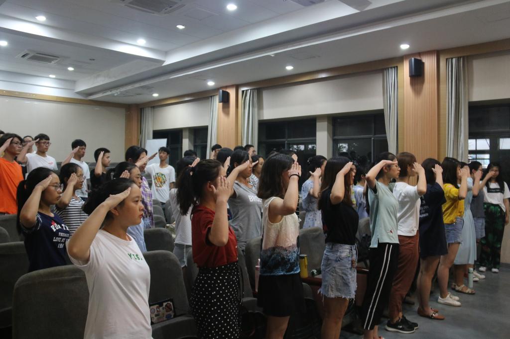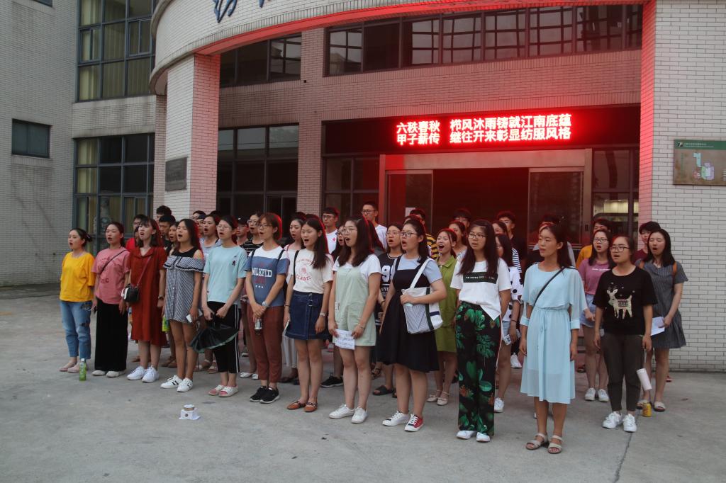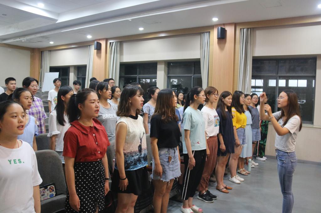 校歌》和《游击队之歌》。结束一天的队列训练后,合唱团的同学们准时来到纺服学院集体练歌。合唱团的所有同学都激情饱满地投入到歌曲演唱中,唱出对江大的深厚情感,唱出奉献青春的时代强音,每一股声音汇聚成响亮的旋律,凝结出广大参训同学的爱校情节和爱国情怀。莫舒霓同学亲身示范,带领大家一起高声歌唱,并提出歌曲演唱过程中出现的问题,帮助大家不断修正、不断磨合。在连续几天的练习过程中,同学们加深了对彼此的了解,合唱团各位同学的关系也更加团结默契。