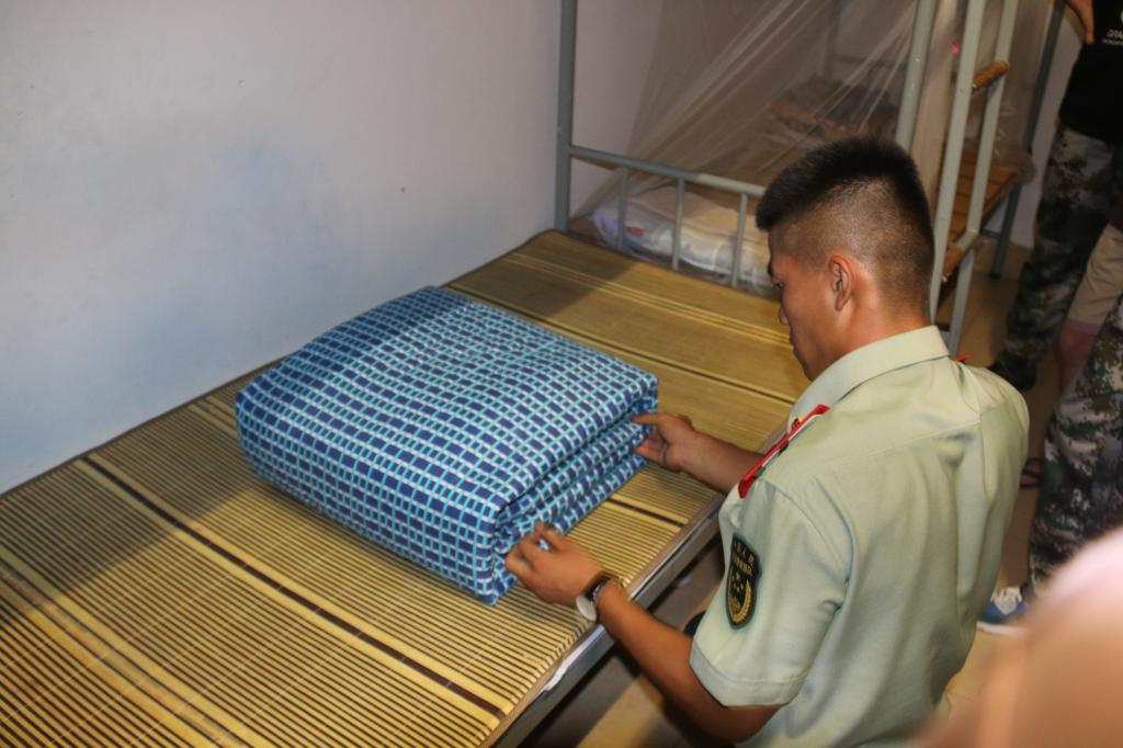 军训教官演示如何叠“豆腐块”