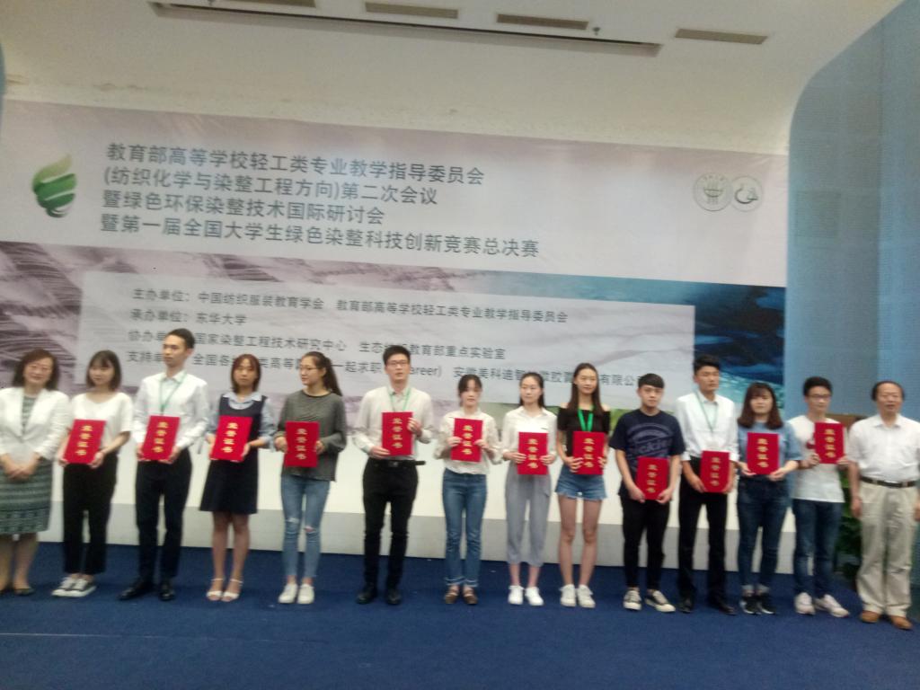 等29所高校的152件作品。专家评委在充分考虑作品的创新性、环保性和应用性基础上,评审出33项作品进入决赛环节。纺服学院15级轻化工程朱逸行团队的《天然植物染料染制品的鉴定方法研究》从众多的天然染料相关参赛作品中脱颖而出,喜获一等奖;17级纺织化学与染整工程硕士胡安然团队的作品《纳米乳胶颜料的制备及其在Lyocell 纤维原液着色中的应用》喜获二等奖。