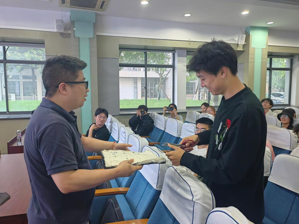 张典堂院长以“先进编织复合材料与空天海”为主题,生动地向同学们介绍了纺织在航空与深海领域的应用、学院在研的各类纺织结构织物以及创新创业大赛相关事项。他指出,纺织行业已不是传统的纺纱织布,而是在与多学科交叉融合的过程中,朝着“面向世界科技前沿、面向经济主战场、面向国家重大需求、面向人民生命健康”的方向发展。其间,张院长向现场同学们展示了一系列复合材料织物,使同学们对纺织行业有更加深刻的认识。张院长鼓励同学们多多跨学科了解知识,提高专业技能,勉励同学们要“做追梦纺织人,担强国纺织责”。