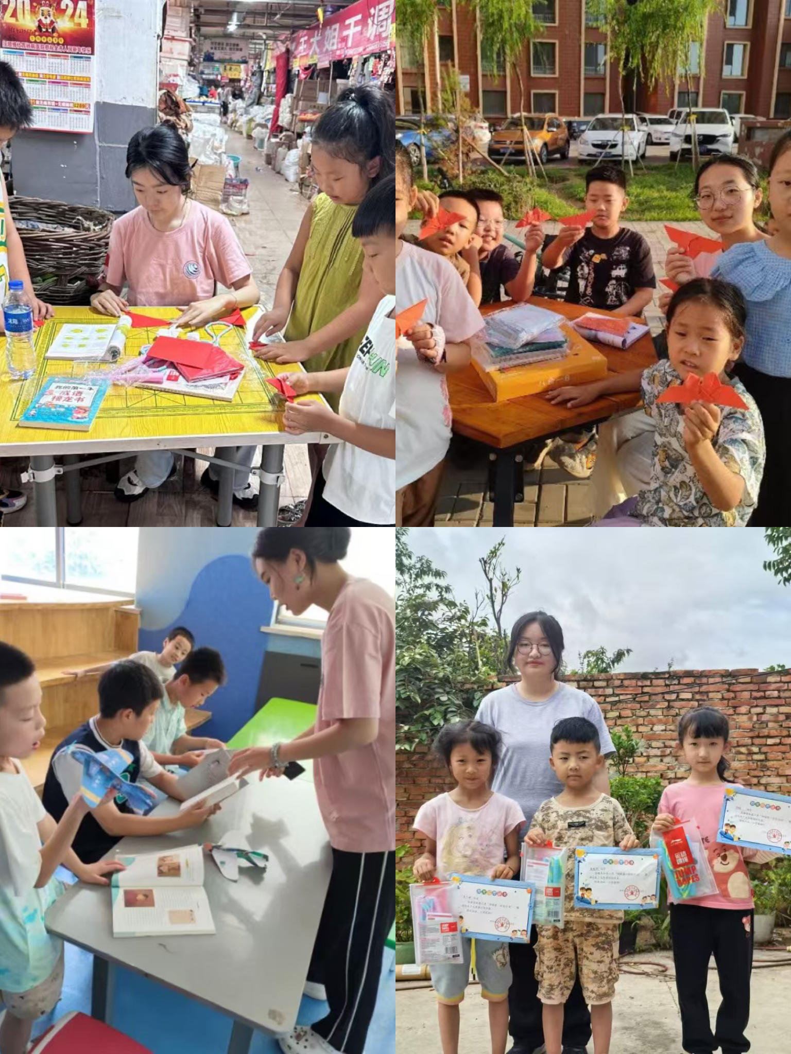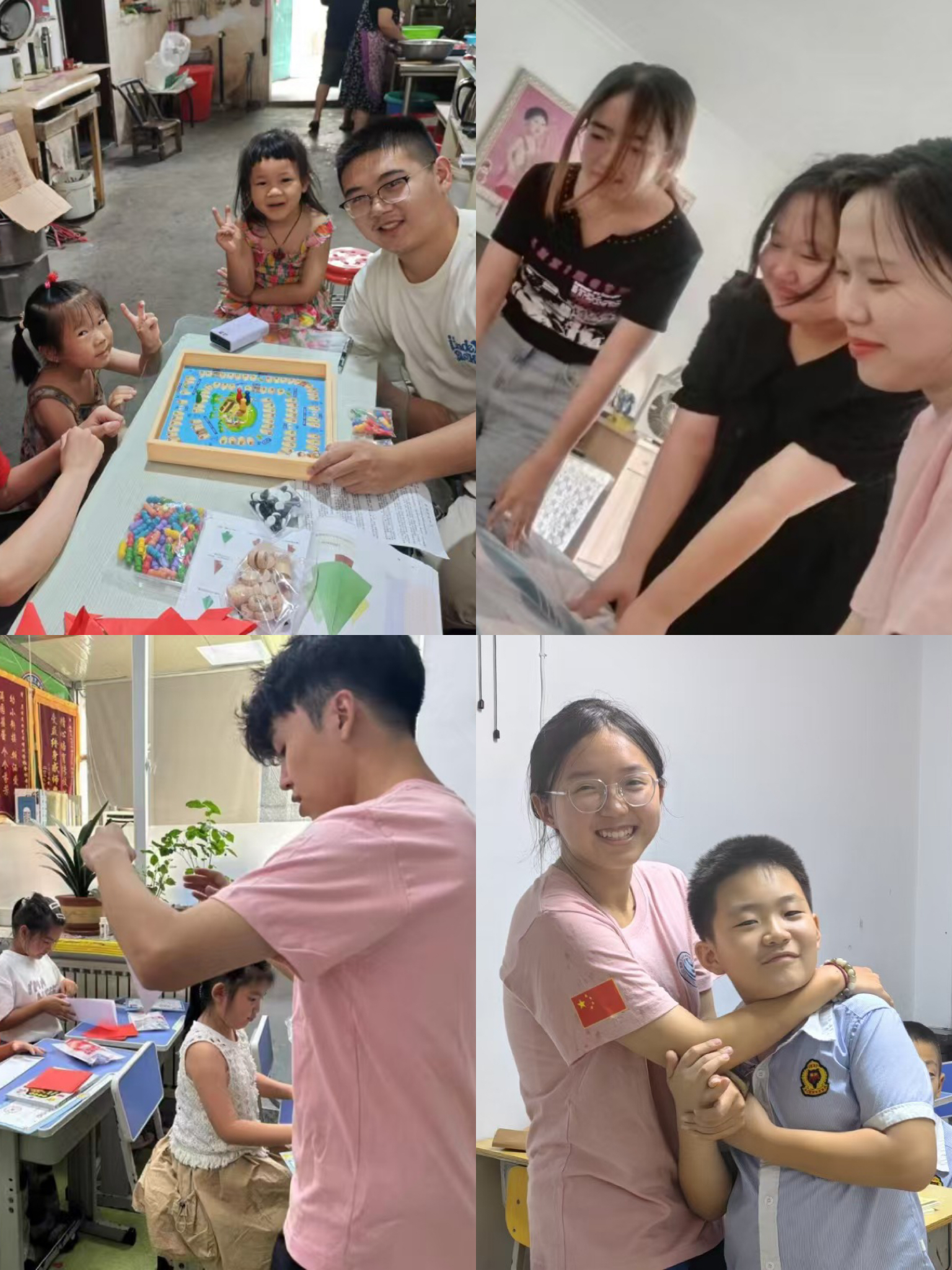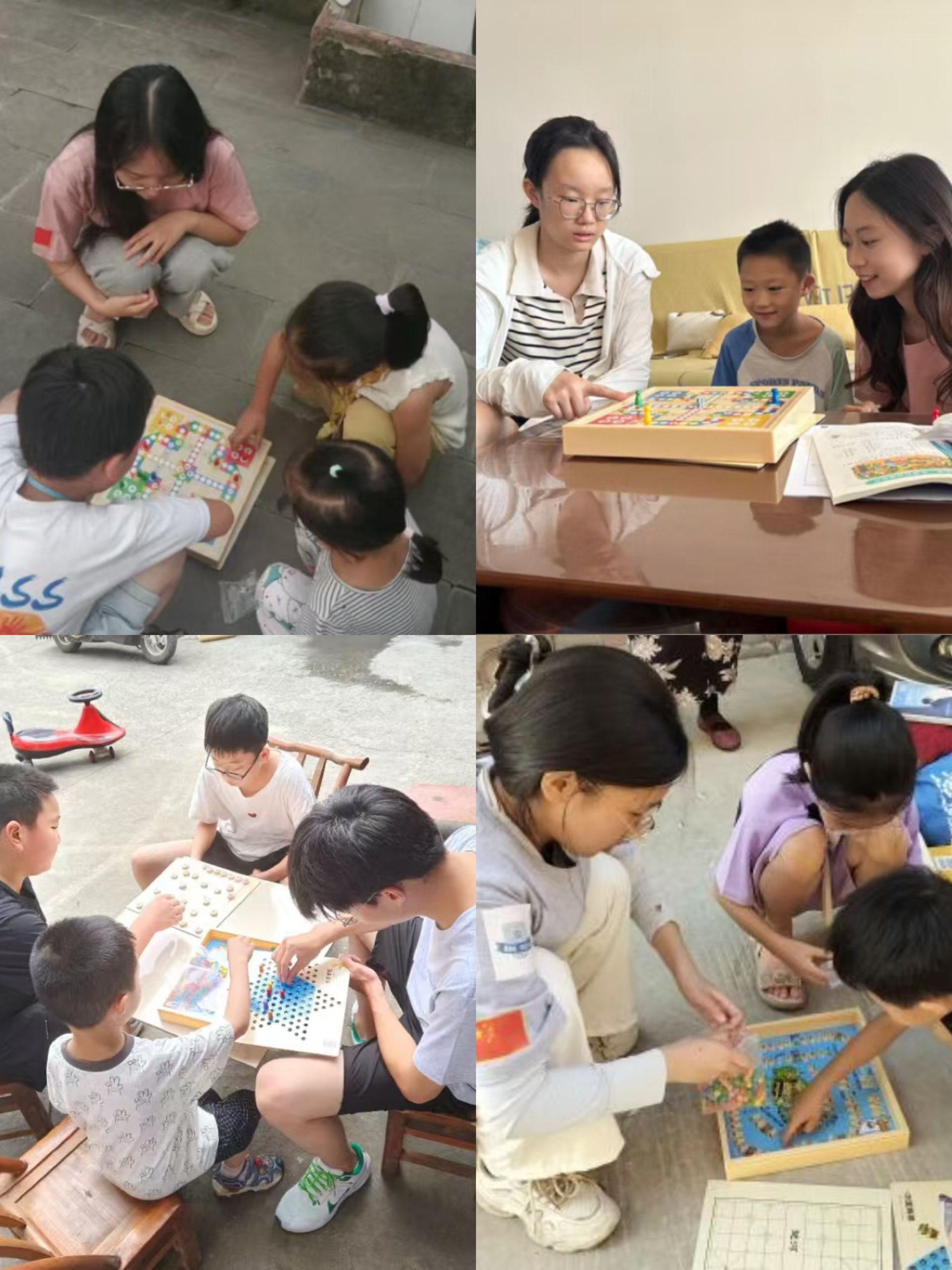 实践成员王生域、王艺璇、李昱铮、邵钰涵、朱一迪等实践成员主动联系家乡当地的社区、村委会、教育中心,以基金会发放的物资为基础,通过开展一系列妙趣横生的跳棋大赛、折纸大赛,为孩子们带去别开生面的纺织小课堂,用爱点亮被遗忘的角落。