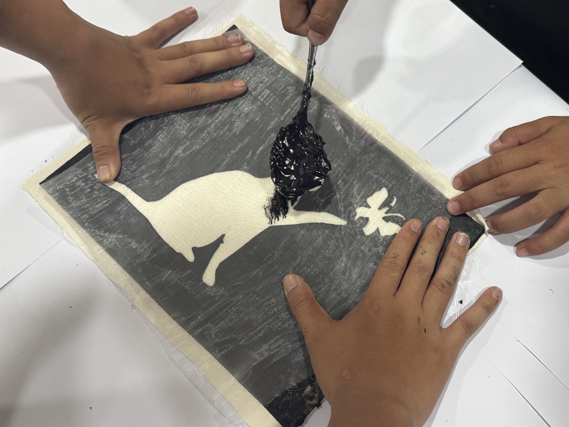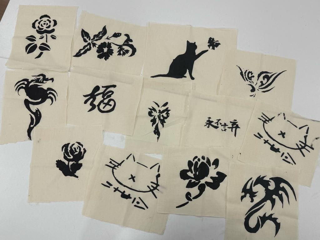 宣讲结束之后,同学们开启了丝网印花制作。大家精心挑选刻板,手持刮板,透过丝网将印染黑墨均匀铺展。纺织学子凭借天马行空的创意思维,为每一次印染注入灵魂。不一会儿,一张张棉布华丽转身,化身为精美且鲜活的手工艺品。