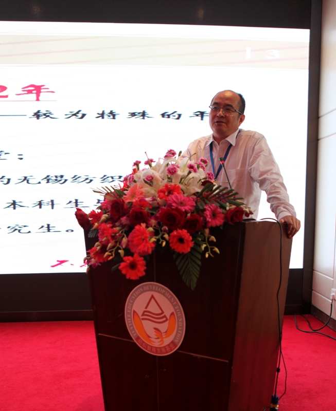 纺织服装学院副院长付少海校友向大会作了学院年度发展报告,他从学院的历史沿革、专业设置、师资队伍、基地平台等方面全面地介绍了学院发展状况和取得的成绩。也向各位校友对纺织服装学院的发展做出的贡献表示感谢。