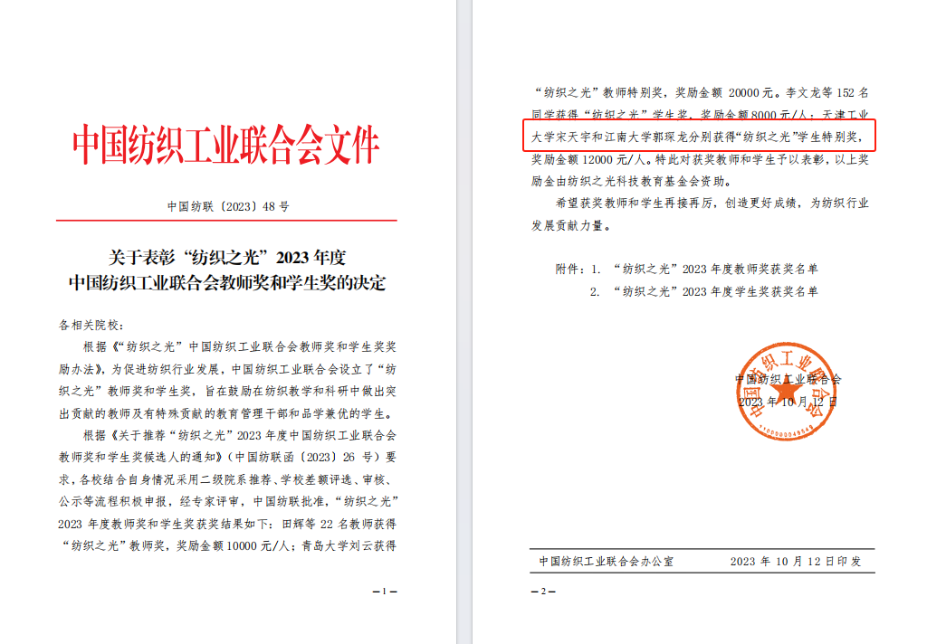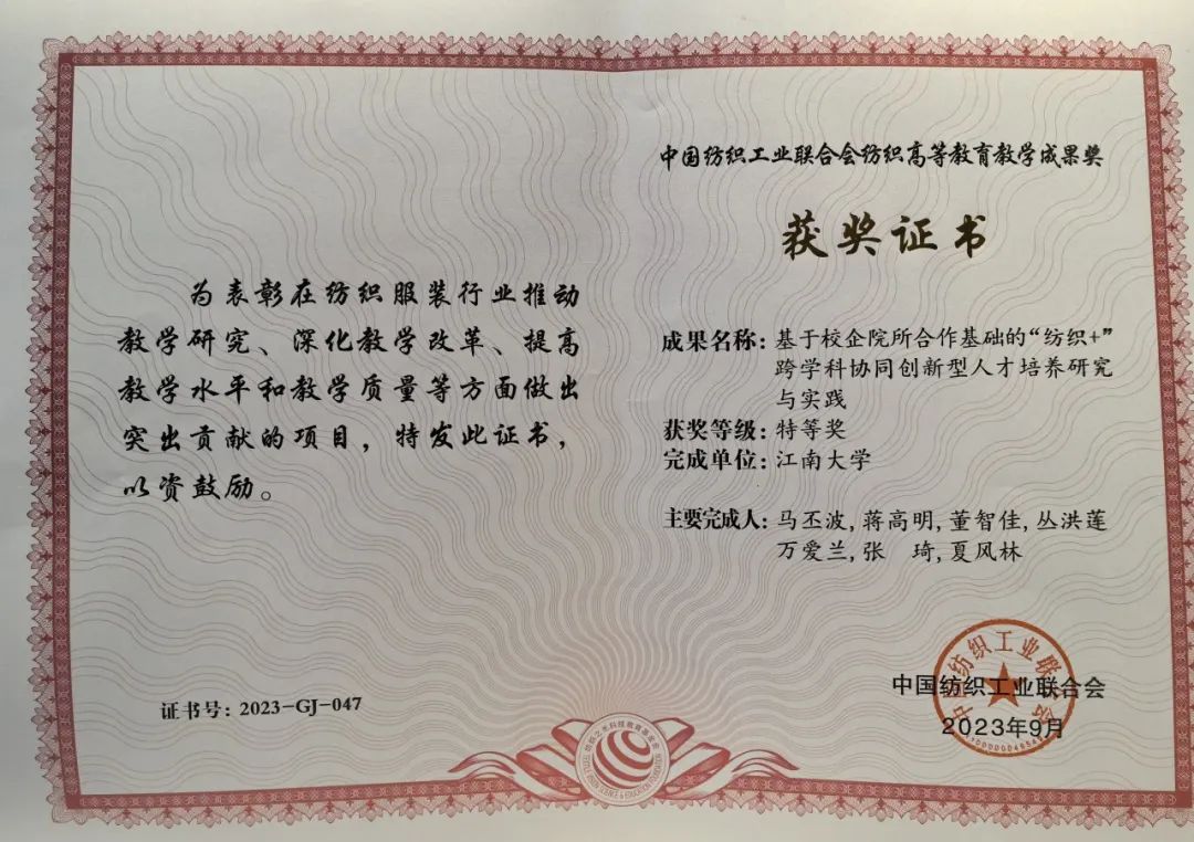 马丕波教授荣获“纺织之光”教师奖(全国仅22位),陈亚君、高鹏翔、郭琛龙、金芳羽、刘帅4位学生荣获“纺织之光”学生奖,郭琛龙荣获学生特别奖(全国仅2位)。由马丕波、蒋高明等教授共同完成的“基于校企院所合作基础的‘纺织+’跨学科协同创新型人才培养研究与实践”成果荣获纺织高等教育教学成果奖特等奖,由王清清、黄锋林等教授共同完成的“PBL研究型教学理念在‘纺织材料学’线上线下贯穿融合式教学中的课程构建与实践”荣获教学成果奖一等奖。