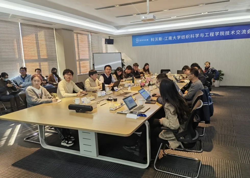 副院长、针织技术教育部工程研究中心新型材料室主任马丕波教授、董智佳副教授、陈超余副研究员等一行赴科沃斯机器人股份有限公司进行了走访交流,科沃斯研发硬件总负责人、技术发展部负责人徐子茜,以及地宝沁宝窗宝等和产品线负责人及研发工程师等38人就机器人用纺织材料的现有问题及解决方案等进行了讨论。