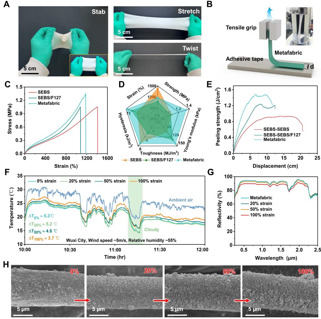 4.超织物的快速水分蒸发(0.31 g/h)和高水分输送指数(1220%)提供了良好的热湿舒适性,可以预防剧烈运动后的热相关疾病。此外,我们发现超织物在不同应变(0% ~ 100%)下具有机械自适应冷却性能,从而对穿戴过程中产生的复杂变形具有良好的适应性。